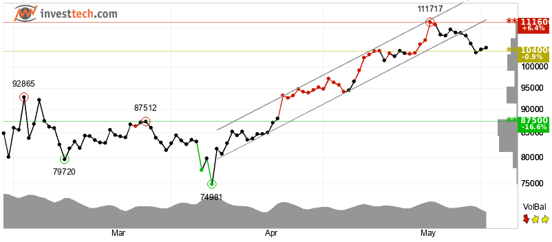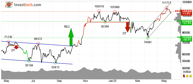 In the medium term, InvestTech shows Bitcoin has broken out of its medium- to long-term upward trend channel. This can indicate either a more gradual increase in speed or the onset of a more horizontal trend. The cryptocurrency has slightly declined below the support level of $106,000.