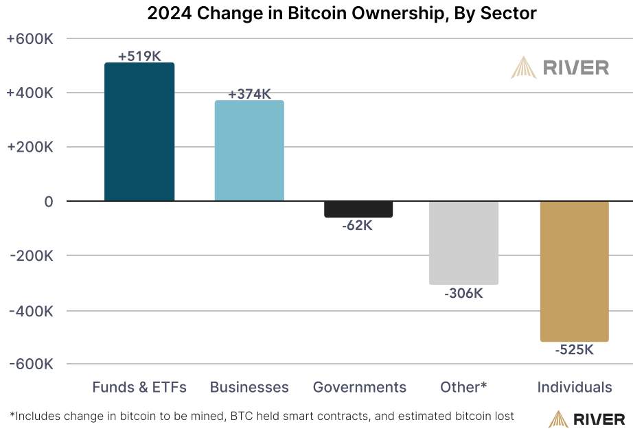 ETFs and businesses have become the primary buyers, with a dramatic shift in Bitcoin accumulation since last year.