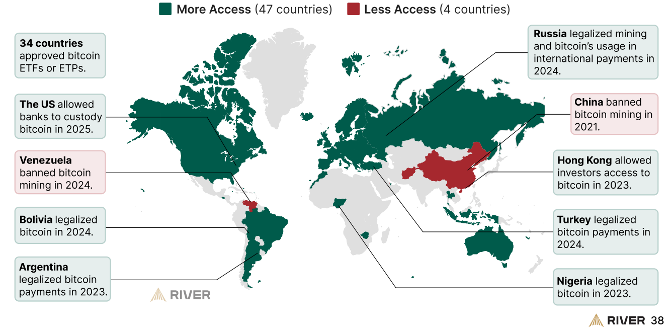The global adoption of Bitcoin is also increasing rapidly. The regulatory changes to Bitcoin since 2020 have increased, with 34 countries approving Bitcoin ETFs and ETPs.