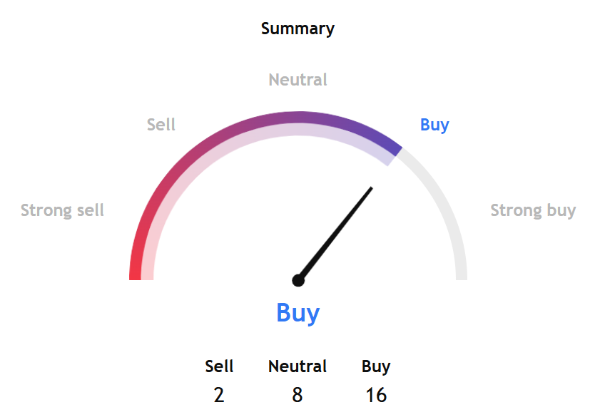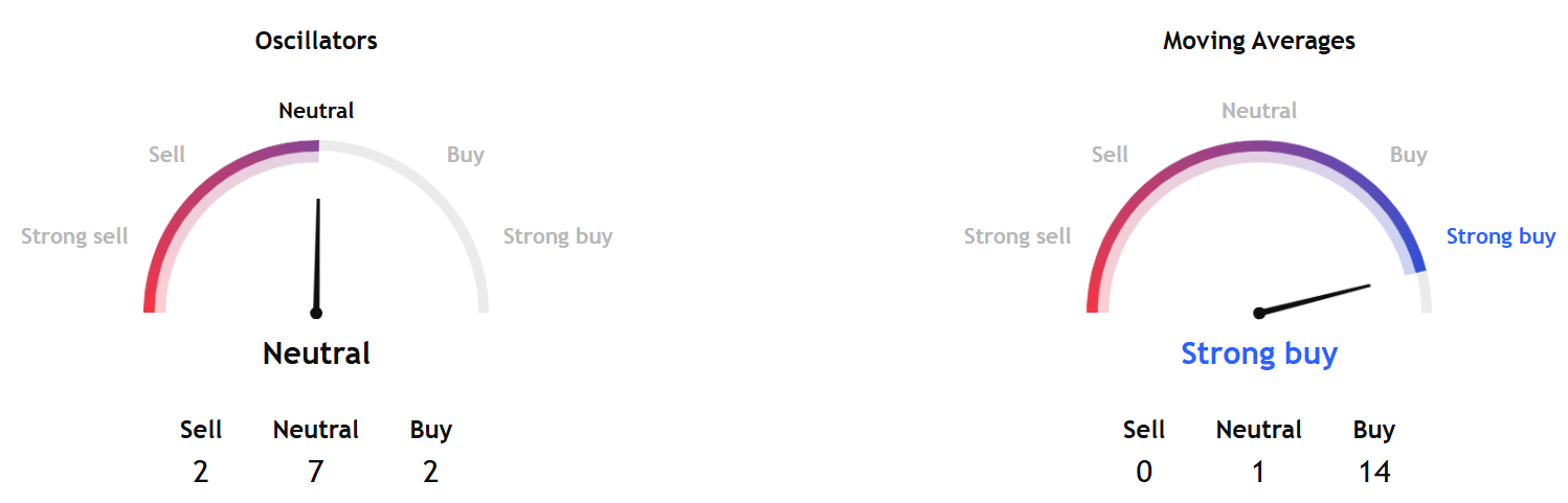 While the oscillators' indicators show a "neutral" stance, the moving averages' indicators show a "strong buy" signal.