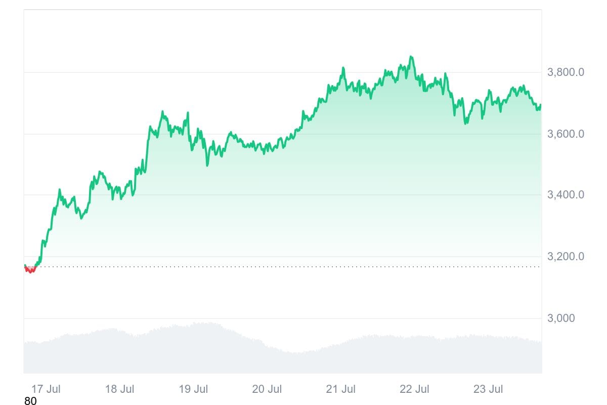 The institutional capital influx has translated directly into price momentum. After months of consolidation around $2,617, Ethereum broke decisively through the $2,700 resistance level on July 10, triggering a rally that carried the token to $3,859.36 earlier this week, representing gains of over 30% from the breakout point.