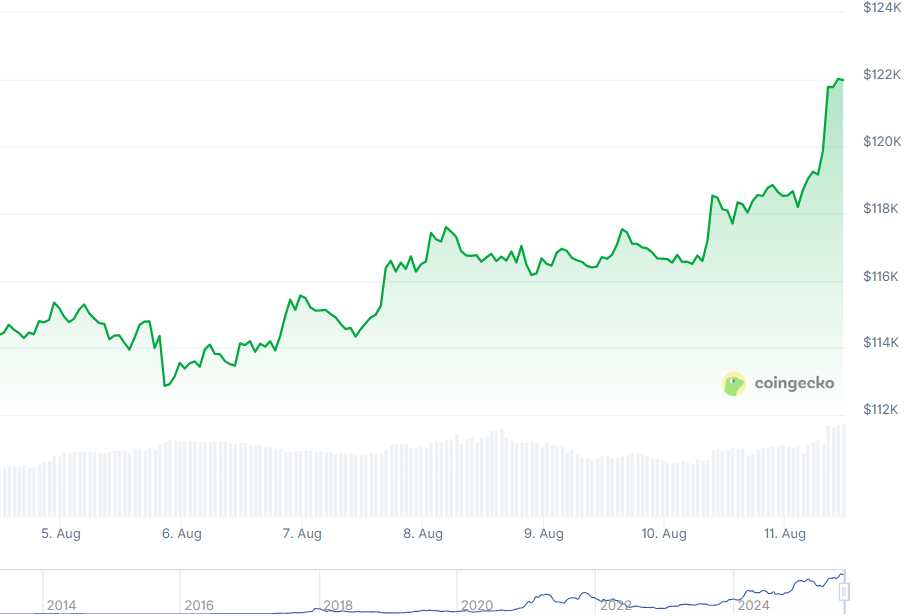 Bitcoin prices surged by as much as 3.3%, reaching over $122,000 and approaching its all-time high.