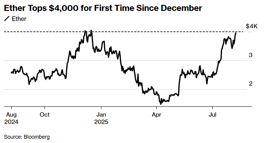 Ether surged beyond $4,300 for the first time since December 2021, after a robust weekend. On Friday, the crypto experienced an increase of up to 3.5%, reaching $4,013 in New York, before settling around $3,965 - it is up nearly 22% over the past week.