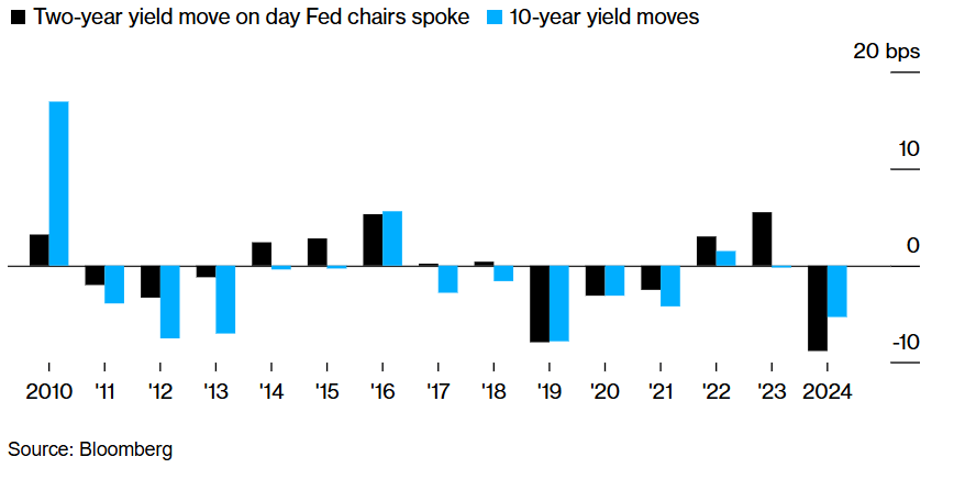 At the previous year's symposium, he suggested that the central bank is prepared to lower borrowing costs from a two-decade peak. On the same day that the comments reinforced traders' expectations for a rate cut, two-year rates declined.