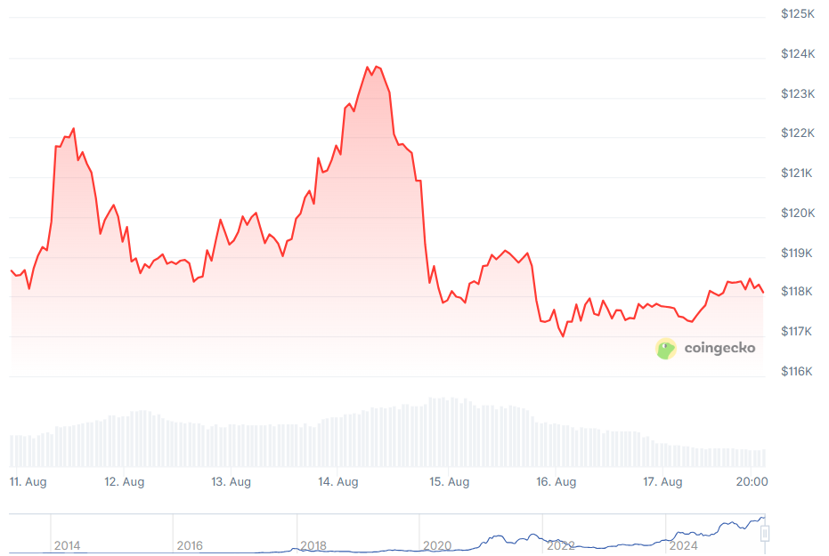 Bitcoin fell and flatlined at around $118,000 after a new all-time high of above $124,000 on Thursday. It is currently trading at around $115,000 as of publication time. Broader crypto tokens showed a similar trend, with Ethereum down by around 10% from last week's highs to around $4,270.