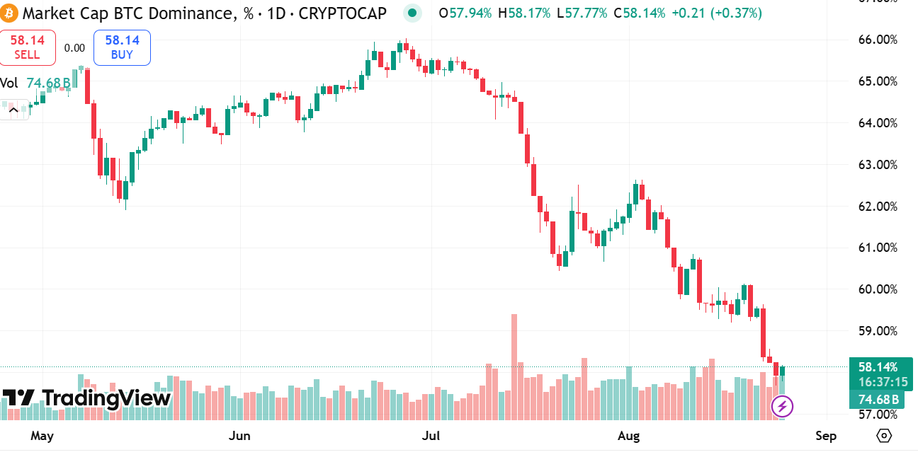 According to TradingView, the current Bitcoin dominance stands at 58.14%, a decline from approximately 61% at the start of this month, indicating a shift in investor attention towards altcoins.