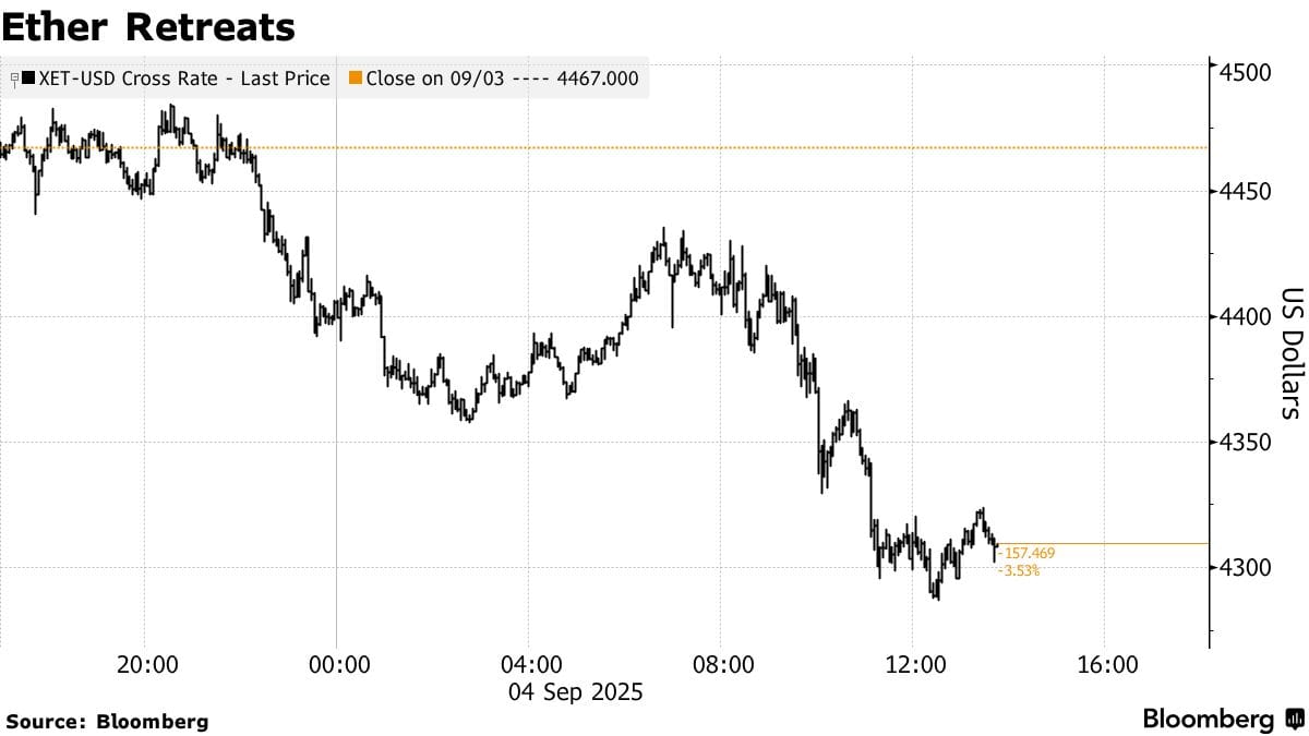 The market is characterized by consolidation now, with Bitcoin approximately 10% below its peak, whereas Ether is stable around $4,300 but still 13% away from its all-time high of $4,955 reached on August 24.