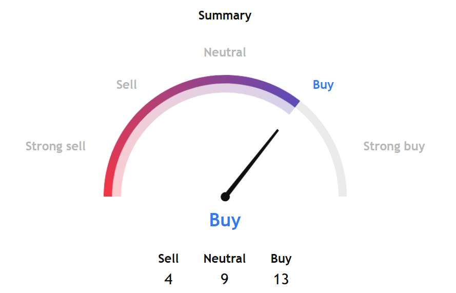 A sub-gauge of oscillators gave a neutral signal, while the moving averages pointed to a 'strong buy' suggestion.