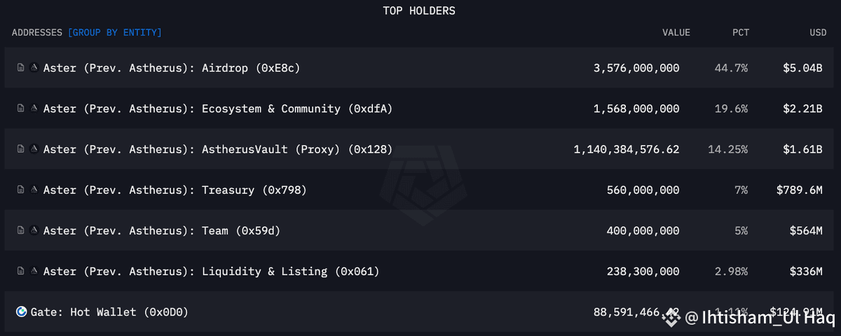 Onchain analysis reveals significant token concentration that has drawn scrutiny from crypto researchers. Six wallets control approximately 96% of ASTER's 8 billion total supply, with the largest single wallet holding 44.7% or roughly 3.58 billion tokens.