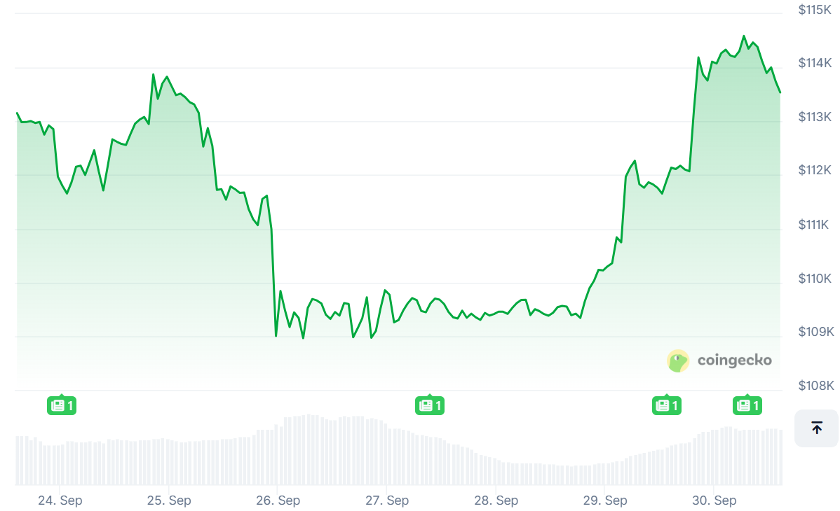 The OG token was last trading around $113,500, up over 1.3%, while Ether was holding above $4,170. Bitcoin's price hit a high of $115,970 briefly earlier this month, but has since fallen slightly.
