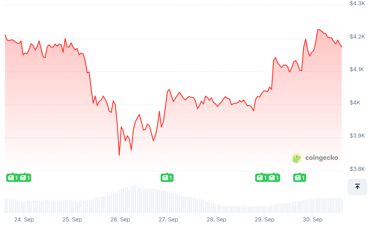 After failing to break $4,000 for a few days, Ethereum has surged 3%.