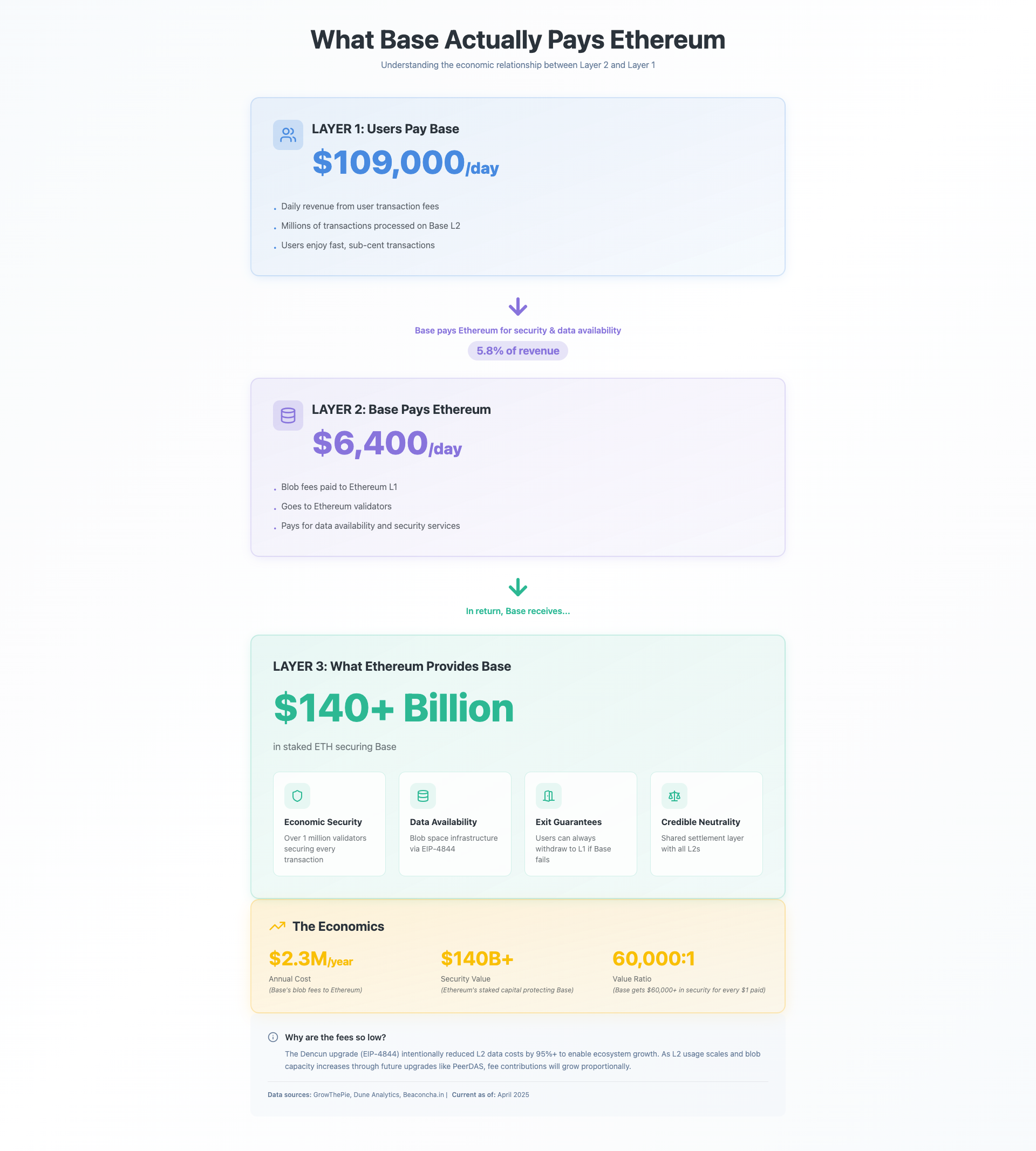 But the value flowing from L2s back to Ethereum stays hidden in block explorers and technical documentation. Base pays approximately $6,400 daily to Ethereum validators—roughly $2.3 million annually. This may sound modest, but it buys access to security infrastructure that would cost billions to replicate independently. Base receives over $60,000 in security value for every dollar it pays Ethereum.