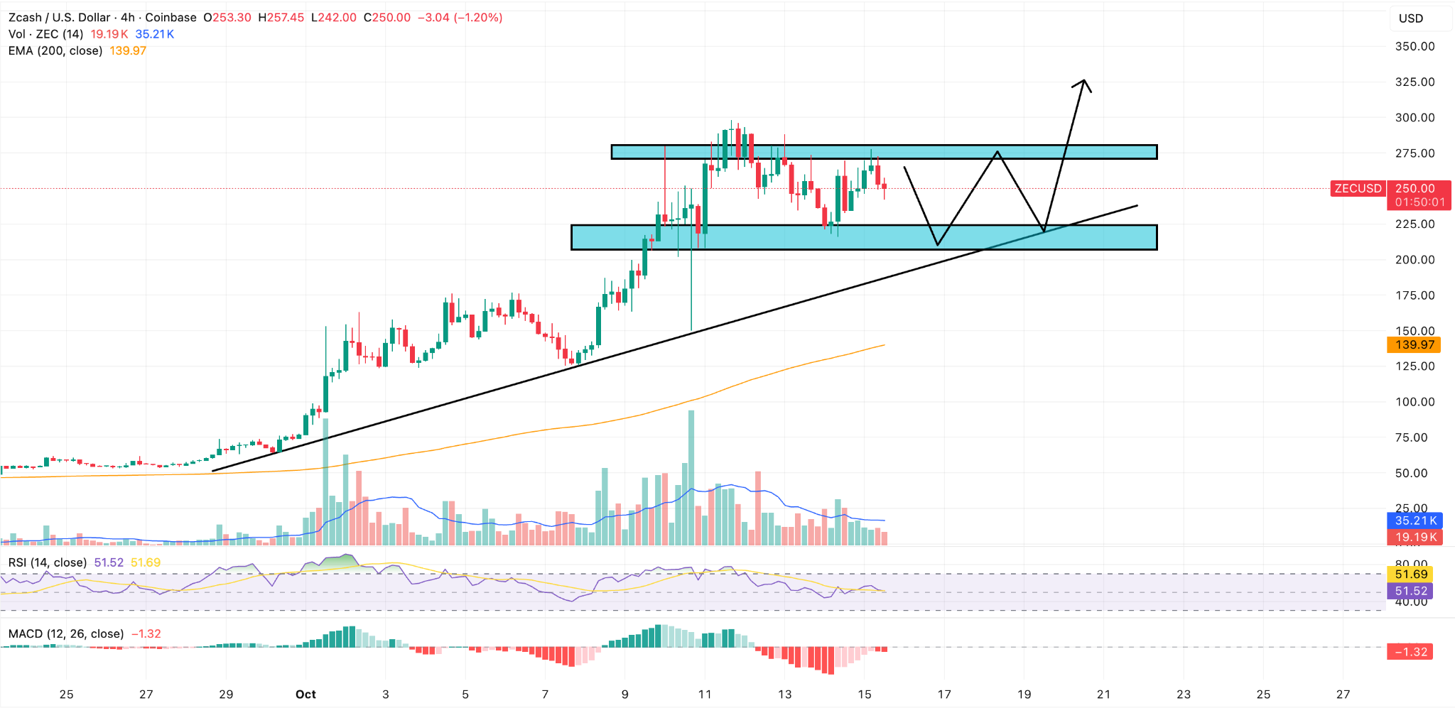 Zcash has experienced a remarkable surge of 40% over the last week, currently valued at about $250 per token. During the last 7 days, it peaked at $295 before plummeting to a low of $180 during Friday’s market downturn.