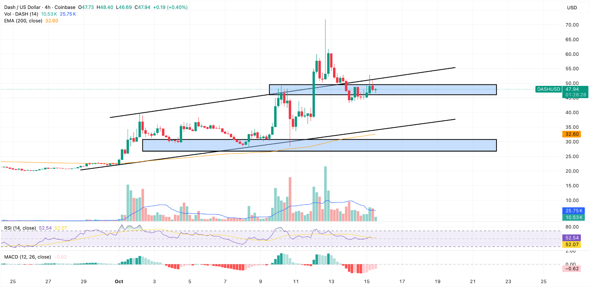 The lowest price the token reached during the downturn was $30, establishing this as the crucial support level to monitor should DASH peak at its current position, which has historically served as a significant supply area.