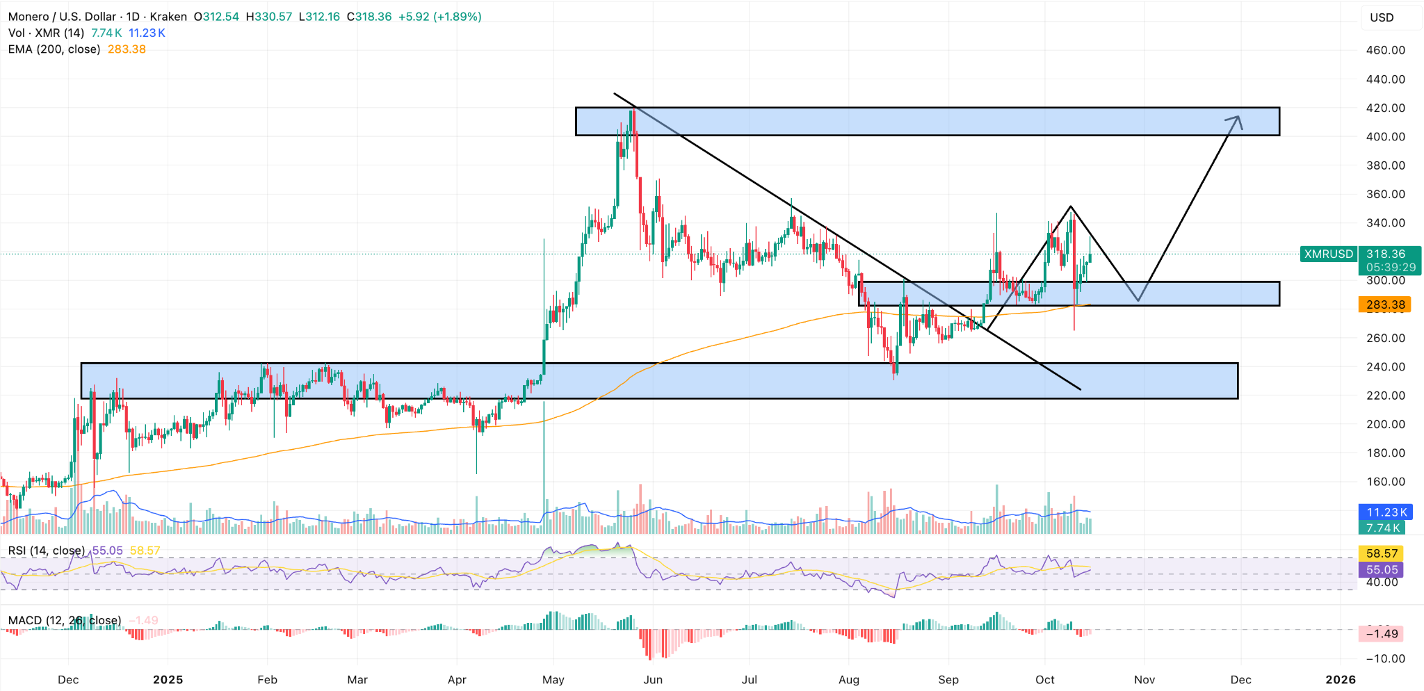 Midway through September, Monero broke out of its downtrend and made it all the way up to $340. Compared to other tokens, the drop that occurred during the flash crash was not as severe.