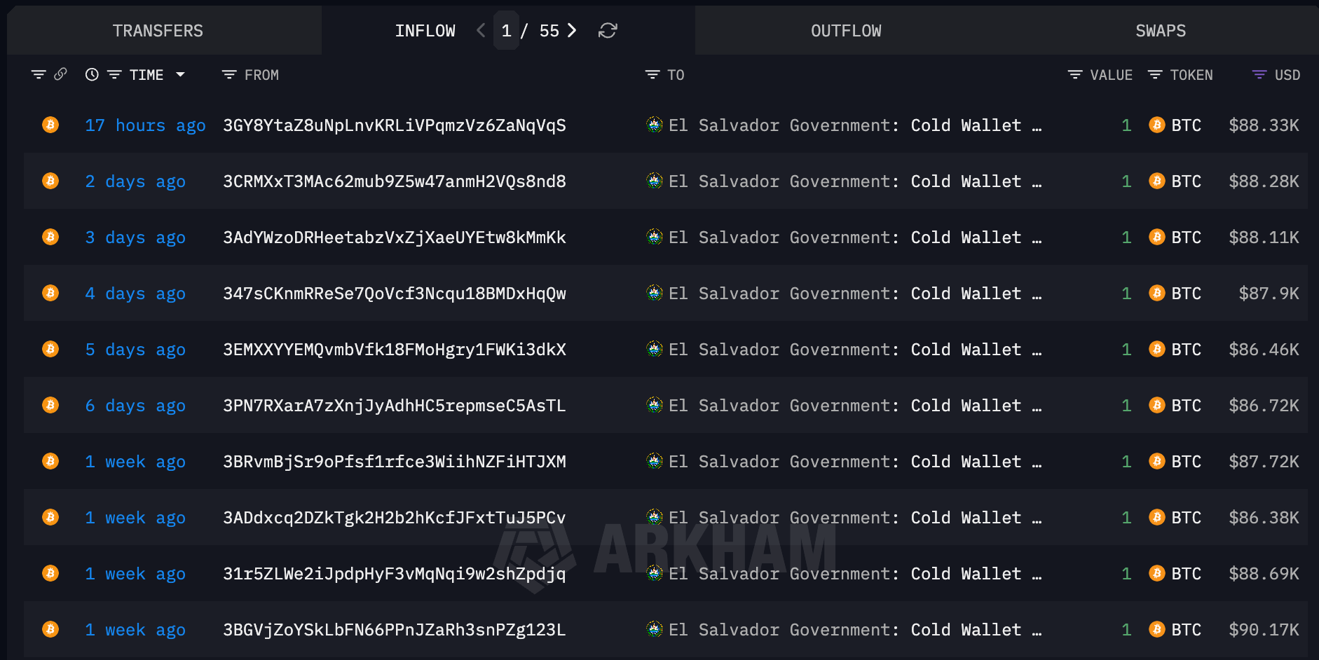 According to Arkham's onchain data analysis, El Salvador continues its consistent daily acquisition of Bitcoin.