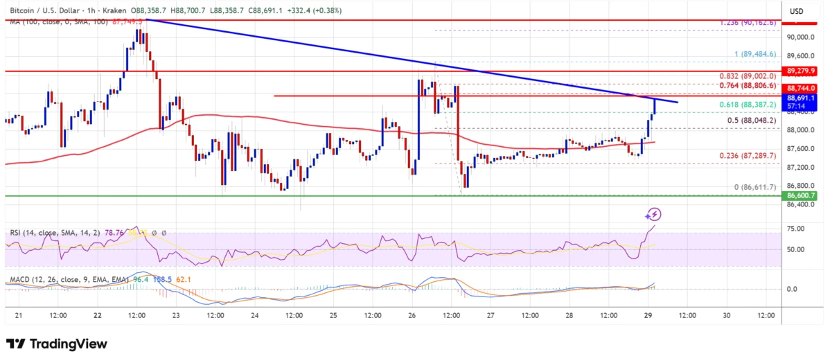 According to TradingView, there is resistance at the $88,750 level, which also happens to be the 76.4% Fibonacci retracement level of the slide from the $89,484 peak to the $86,611 trough.