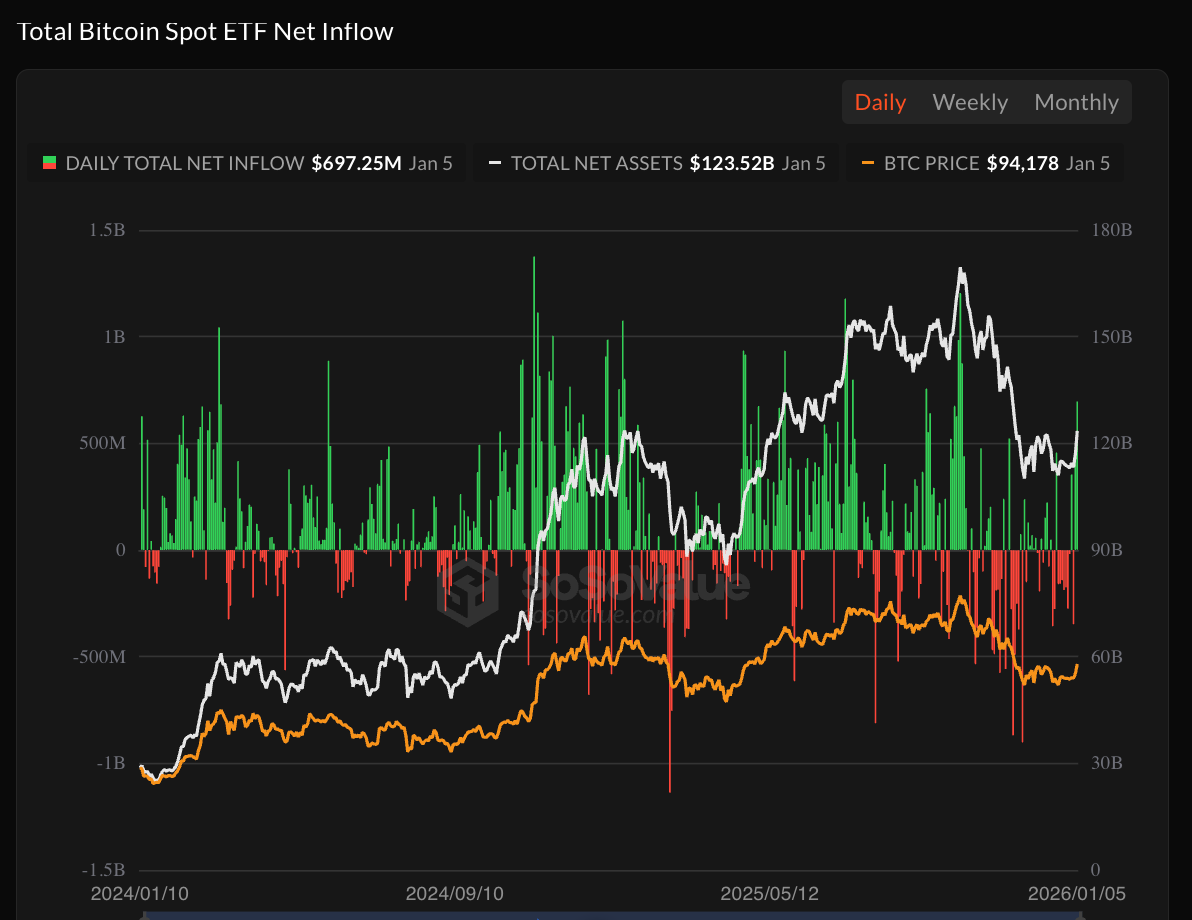 U.S. spot Bitcoin ETFs recorded $697 million in net inflows on January 5, marking the largest single-day inflow in over three months, per Sosovalue data. BlackRock's IBIT ETF led with $372 million in inflows, bringing its total historical net inflow above $62.7 billion.