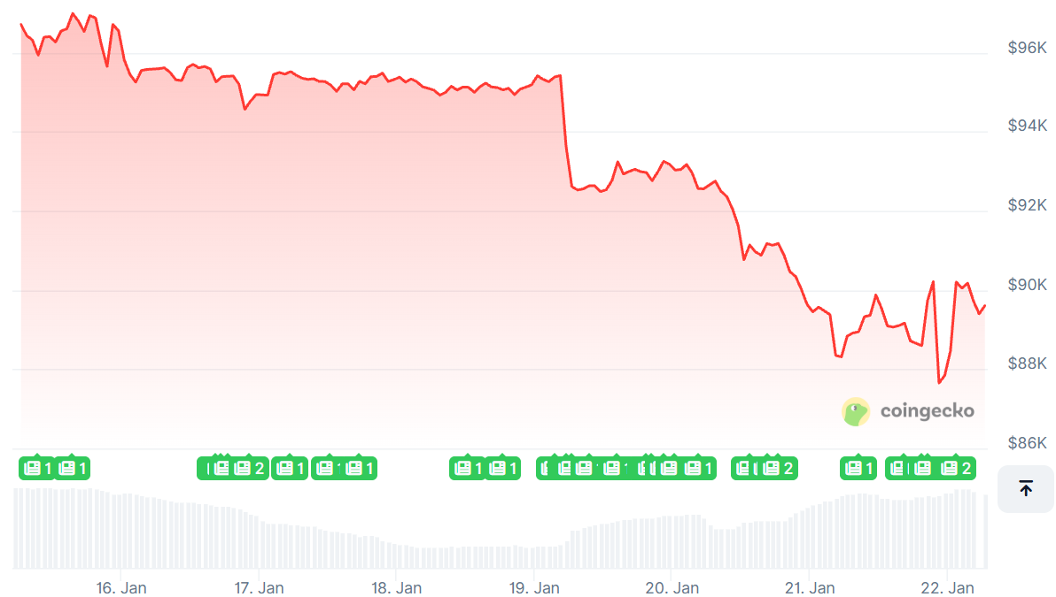 After surging close to the $97k mark last week, the top token crashed post-Trump's remarks that the US would impose harsh tariffs on eight European countries and threats of hefty taxes on eight more sent global markets into a spiral on January 20.