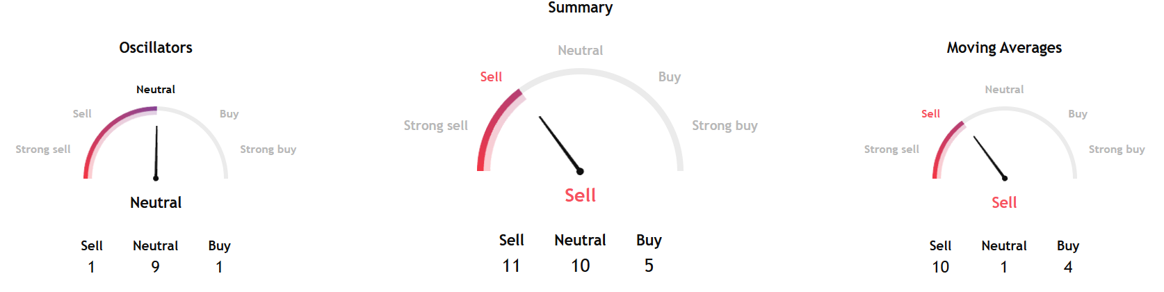 The latest readings show a sell signal for Bitcoin in the week ahead, according to TradingView's summary gauge, which includes key data from moving averages, oscillators, and pivots.