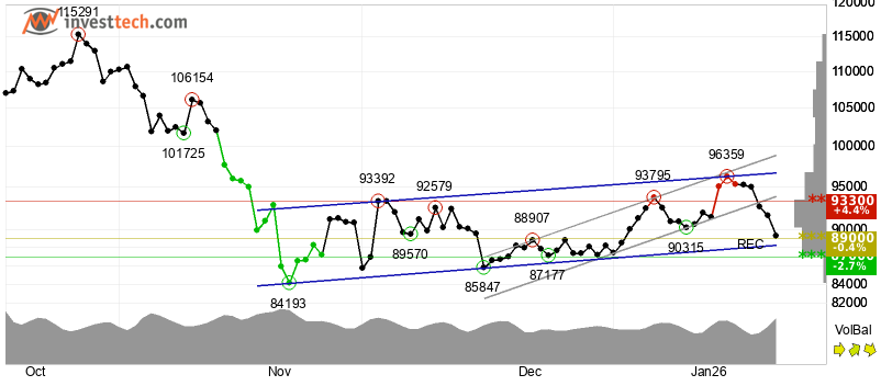 InvestTech said "A decisive break through one of these levels indicates the new direction for the currency. The token is testing support at points $89,000. This could give a positive reaction, but a downward breakthrough of points $89,000 means a negative signal."