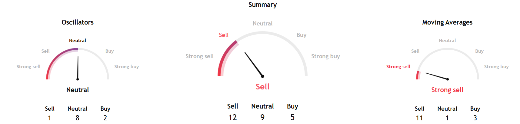 While the short-term sub-indicators under the oscillators gauge reflected a neutral stance, the long-term moving average gauges pointed to a strong sell signal.