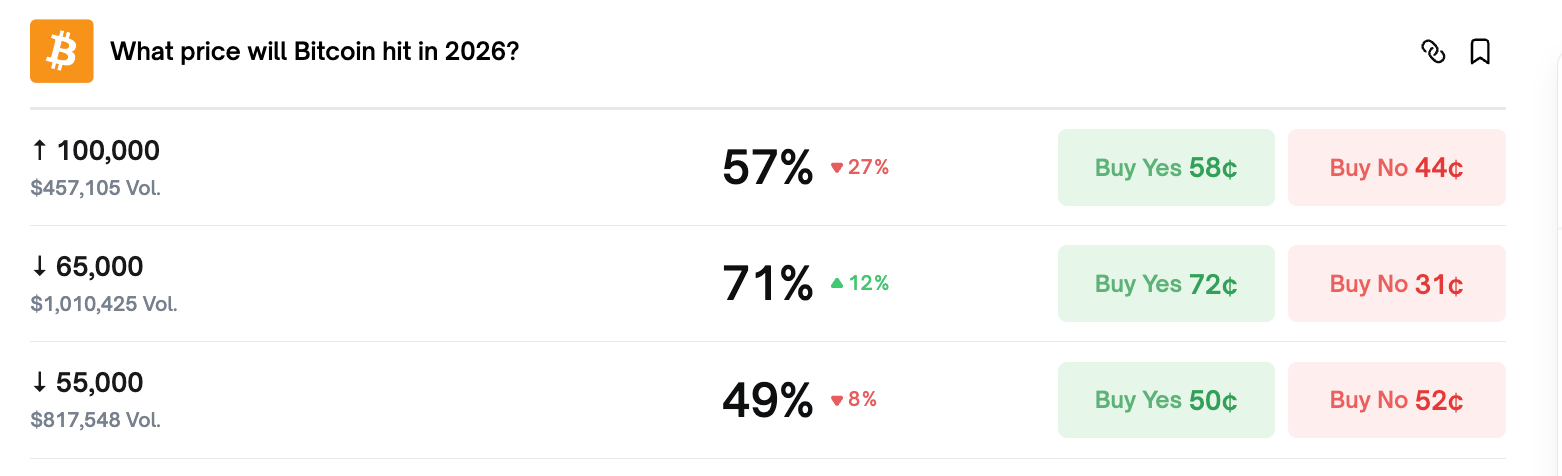 Considerable bets were placed on Bitcoin's anticipated decline below $55,000 and its subsequent recovery to $100,000 by year's end, with estimated probabilities of 40% and 57%, respectively. The willingness of traders to simultaneously bet on both extreme downside and eventual recovery suggests market participants are preparing for significant volatility ahead.
