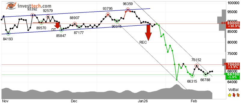 In the short term, InvestTech said, "Bitcoin has broken the ceiling of the falling trend in the short term, which indicates a slower initial falling rate. The token is between support at $66,700 and resistance at $70,600. A definitive breakthrough of one of these levels predicts the new direction."