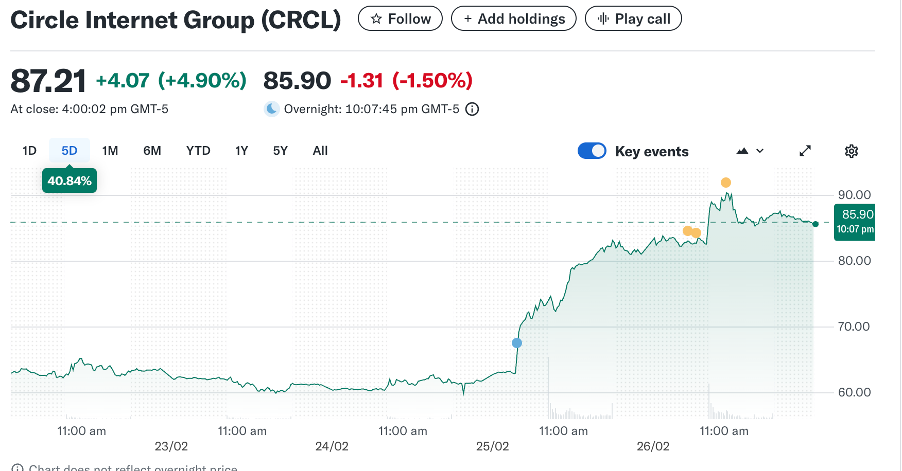 Circle shares have rallied nearly 50% in less than two sessions following the USDC issuer's fourth-quarter results, but analysts say the move reflects crowded positioning rather than a fundamental re-rating.