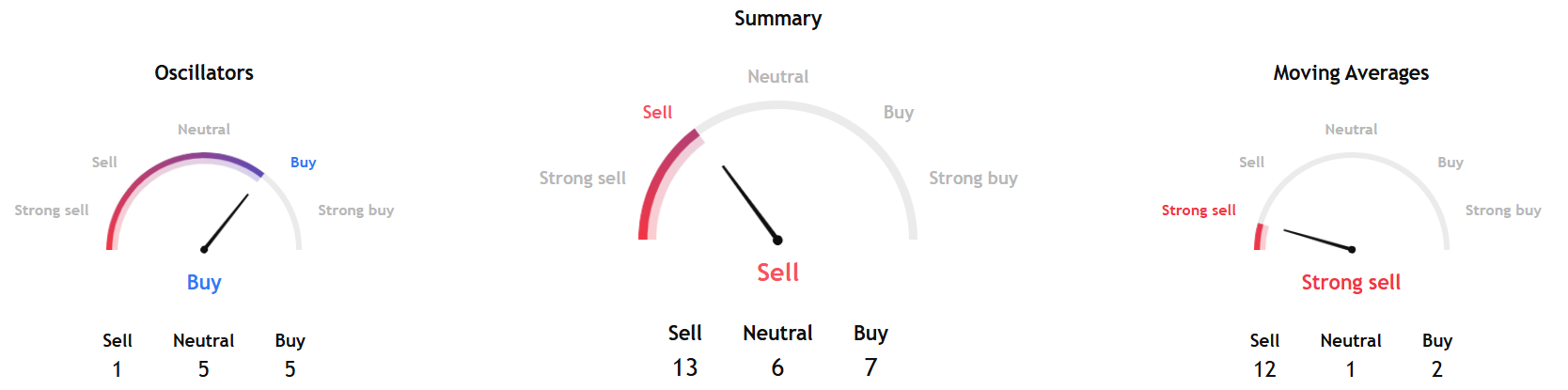 TradingView's overall Bitcoin summary gauge, based on key data from moving averages, oscillators, and pivots for the week ahead, shows a sell reading.