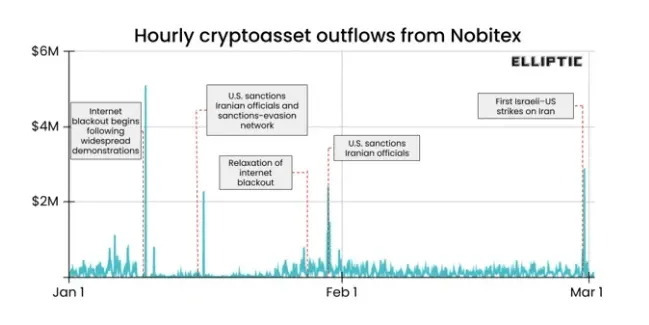 Reports showed a surge in Bitcoin withdrawals from Iran's largest exchange, Nobitex, matching the public news of the airstrikes.