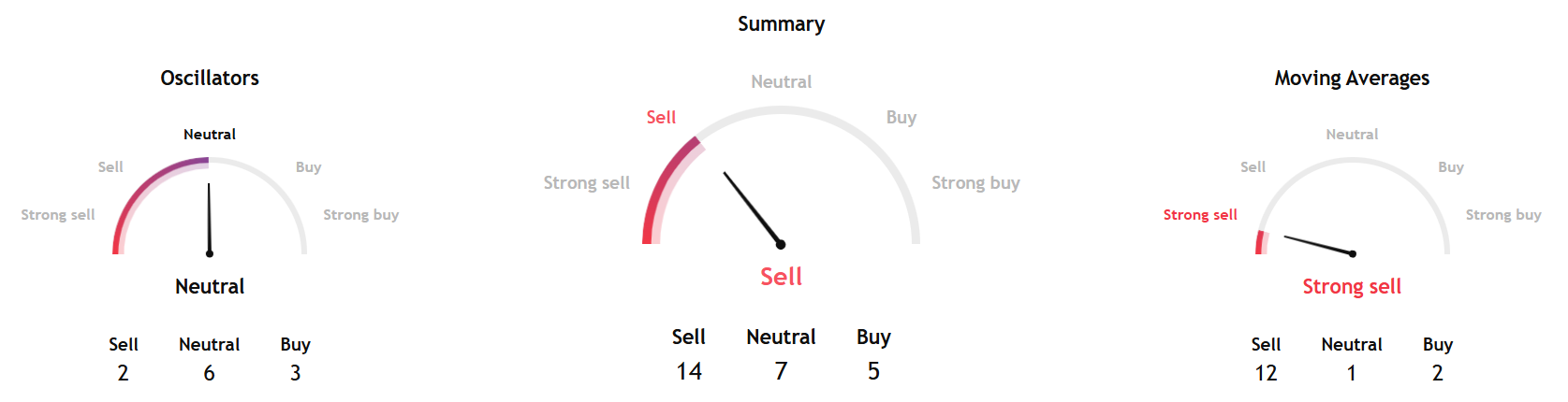 TradingView's technical analysis overview based on key data from moving averages, oscillators, and pivots for the week ahead still signals a sell bias.