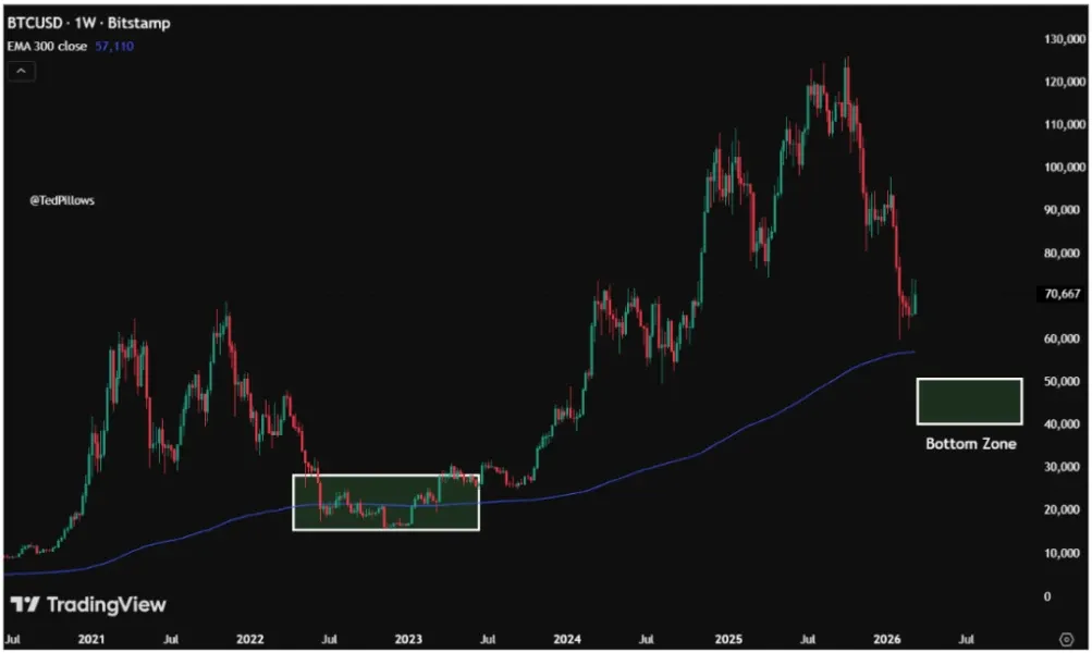 The current value of Bitcoin's 300-week exponential moving average stands at approximately $57,100.
