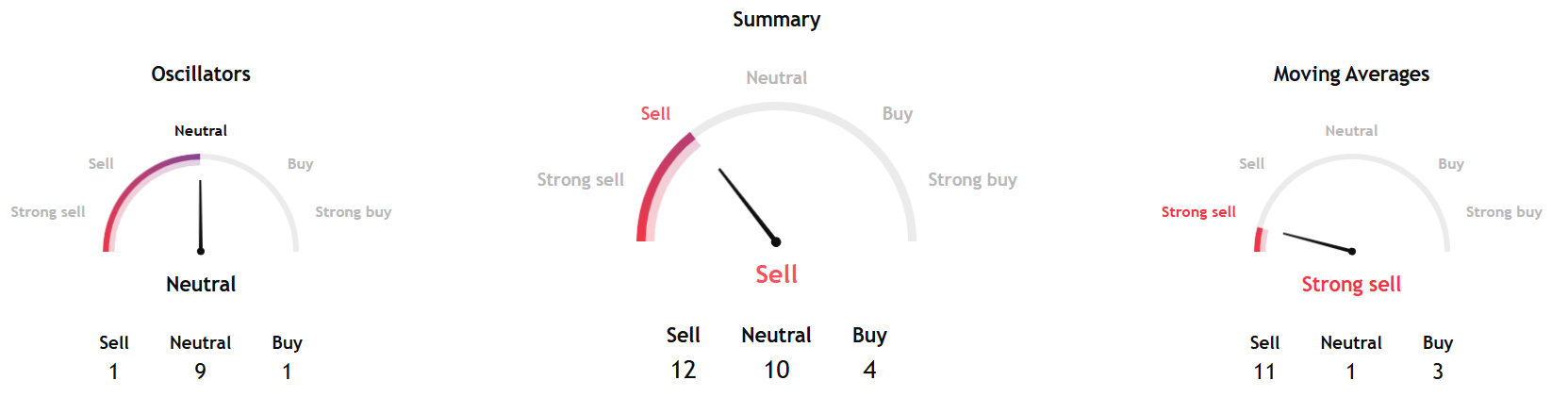 TradingView's technical analysis overview for the week ahead, based on key data from moving averages, oscillators, and pivots, showed a sell signal, even as a sub gauge of oscillators showed a neutral reading.