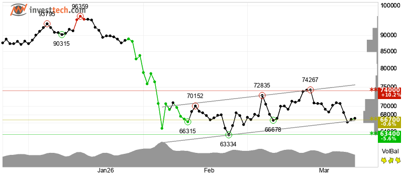 InvestTech said, "Bitcoin shows strong development within a rising trend channel in the short term. This signals increasing optimism among investors and indicates a continued rise. The token is testing support at $66,700. This could give a positive reaction, but a downward breakthrough of $66,700 means a negative signal."