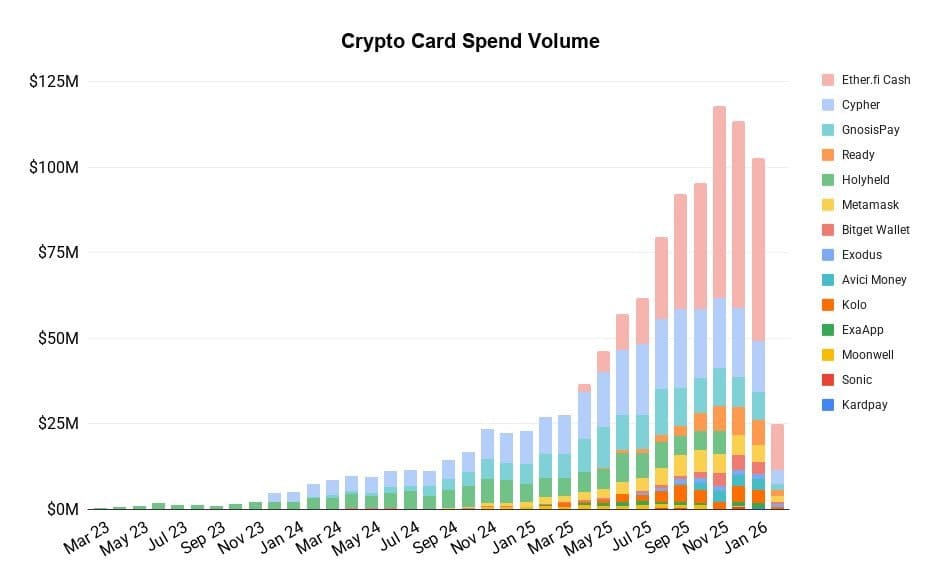 The launch reflects a category that has grown dramatically in a short time. Onchain data shows total crypto card spending volume surging from roughly $10 million per month in early 2024 to over $100 million per month by early 2026. Infrastructure providers have been racing to capture that growth: Rain, a stablecoin card infrastructure provider and Visa Principal Member, raised $250 million in January at a $1.95 billion valuation, with its active card base growing 30 times over the preceding year and annualized payment volume increasing 38 times to over $3 billion.